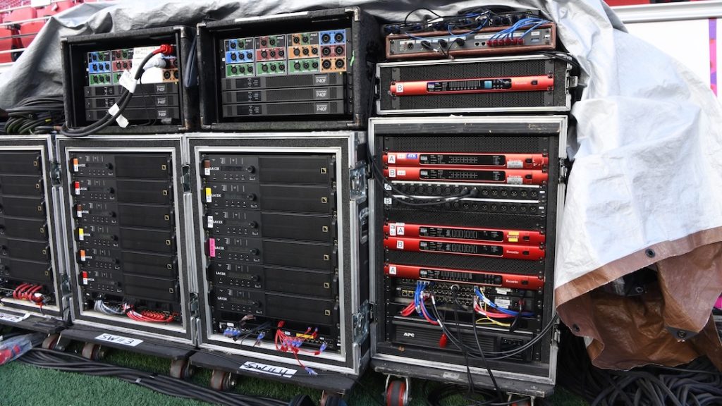 Like last year, ATK employed an L-Acoustics P.A., this year deploying an L-Acoustics AVB drive system for the first time. This year’s setup also featured 28 RedNet D64R 64-channel MADI bridges; 17 RedNet D16R MkII 16-channel AES3 I/O’s to manage digital signal transport with AES for smaller channel counts; 25 RedNet A16R MkII 16-channel analogue I/O interfaces to provide analog backup for the AVB-networked P.A. system; 10 RedNet MP8R 8-channel remote-controlled mic pre’s with dual PSUs to capture audience reaction and Atmos microphones for Apple Music’s Atmos halftime show mix; and seven RedNet AM2 stereo audio monitoring units.