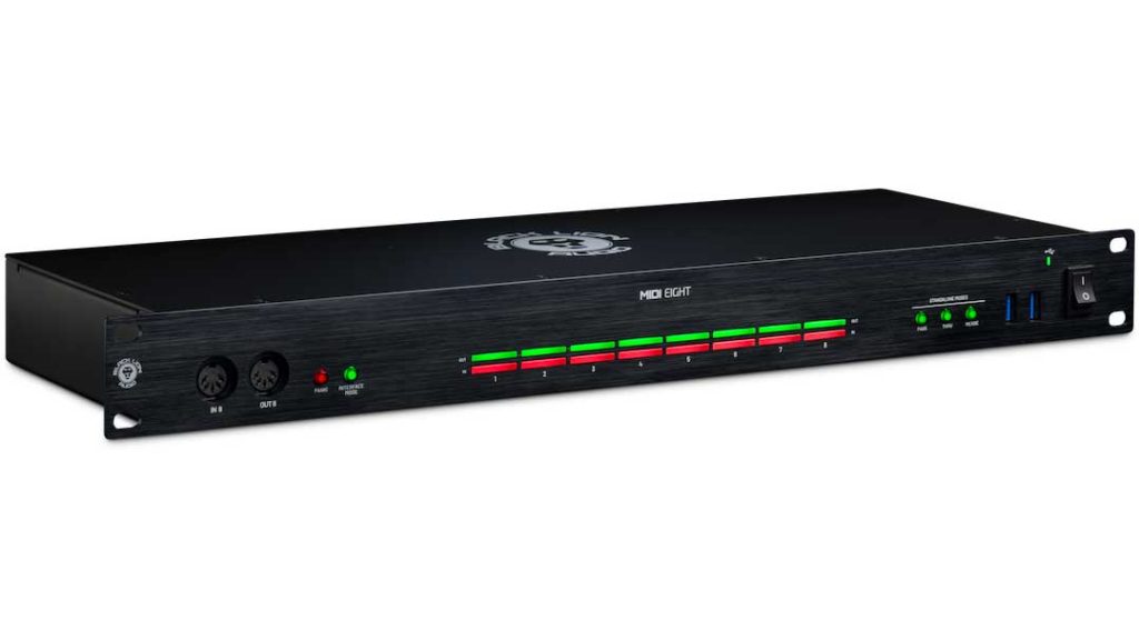 The MIDI Eight can be used on stage, as the MIDI Eight can distribute program changes, synchronize tempo-based effects, and maintain lock-step across an entire live band’s setup. Built to withstand real-world touring demands, it is housed in a black aluminum enclosure with a LED MIDI monitor.
