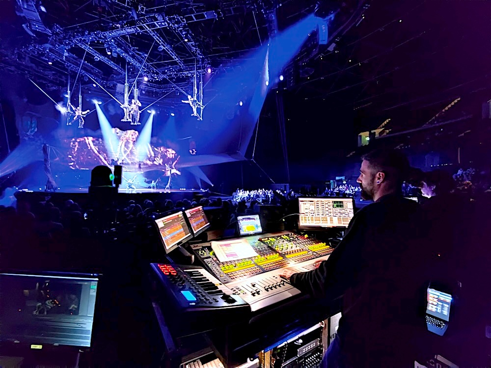 Head of Audio Kevin Adkinson mixes the multi-genre score of OVO on an Avid Venue SC48 console. PHOTO: Janie Mallet