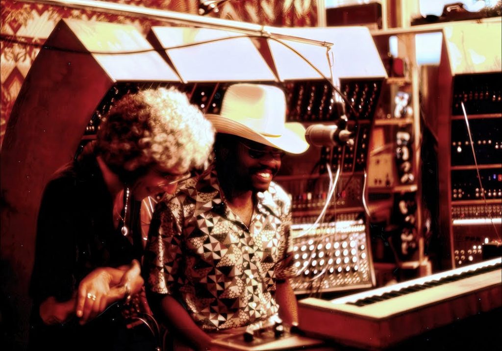 Malcolm Cecil (left) and Billy Preston inside the massive TONTO (The Original Neo Timbral Orchestra) multitimbral polyphonic analog synthesizer. Photo: Courtesy of Jawbone Press.