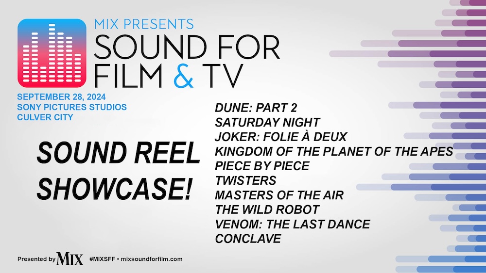 Culver City, CA (September 18, 2024)— The 11th annual Mix Presents Sound for Film & Television event will feature a variety of panels, workshops, keynotes and more, featuring discussions with top audio pros. Newly added to the event is this year’s Sound Reel Showcase!