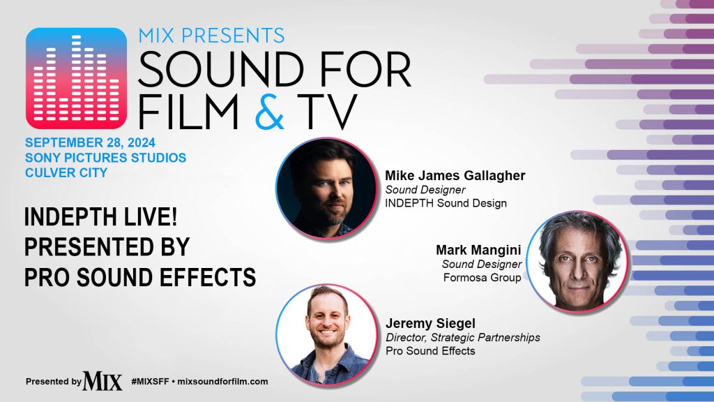 Culver City, CA (September 6, 2024)— The 11th annual Mix Presents Sound for Film & Television event will feature a variety of panels, workshops, keynotes and more, featuring discussions with top audio pros. The all-day event, focusing on the high end of audio post-production, will take place Saturday, September 28, at Host Partner Sony Pictures Studios, Culver City, Calif. Among the offerings is the well-anticipated “INDEPTH LIVE!” panel, featuring Oscar-winner Mark Mangini.
