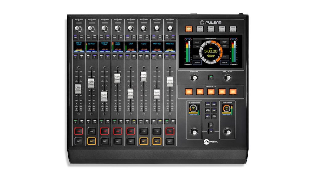 Also new is Axia Pulsar, a compact new AoIP console surface with eight motorized faders (expandable to 16), a touchscreen monitor section and the same audio performance as the company’s larger Quasar XR and SR consoles.