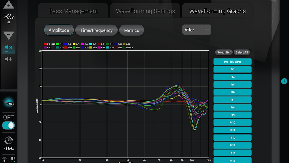 WaveForming employs immersive audio system design practices and a proprietary algorithm to produce low-frequency sound across the entire listening area. Using an active acoustics approach, the software strives to achieve bass uniformity, impact, clarity and detail.